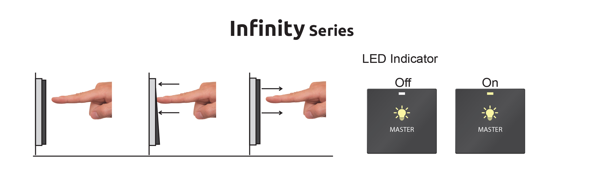 A contemporary edgeless switch design with no visible panel frame, providing seamless beauty and elegant functionality. Each standard size module panel can support from 1 to 6 individual buttons (gang).